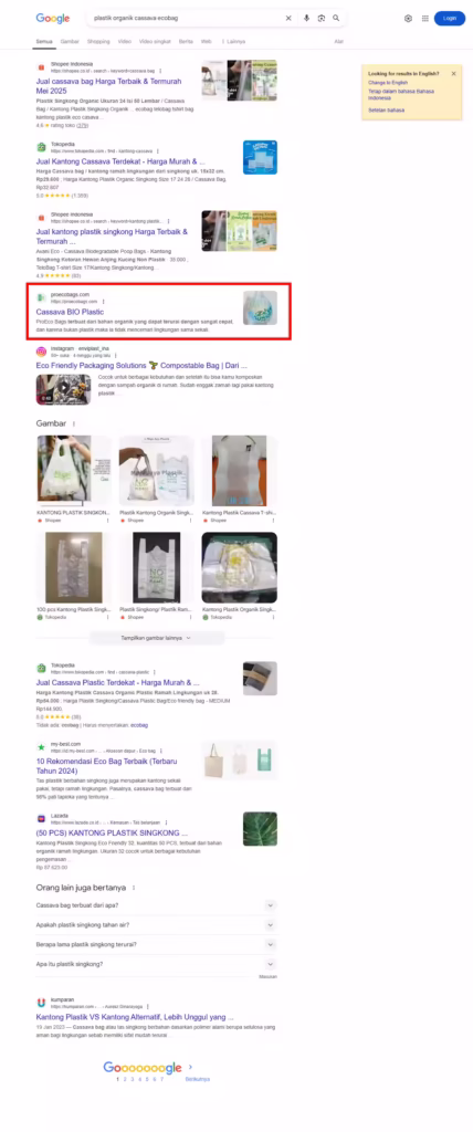 Website ProEcoBags.com berhasil menembus halaman pertama Google untuk kata kunci kompetitif seperti “eco bag cassava”, “plastik organik cassava eco bag”, “cassava bio plastic”. Pencapaian ini sangat berarti karena situs harus bersaing dengan brand-brand besar, marketplace ternama, serta produsen skala nasional.